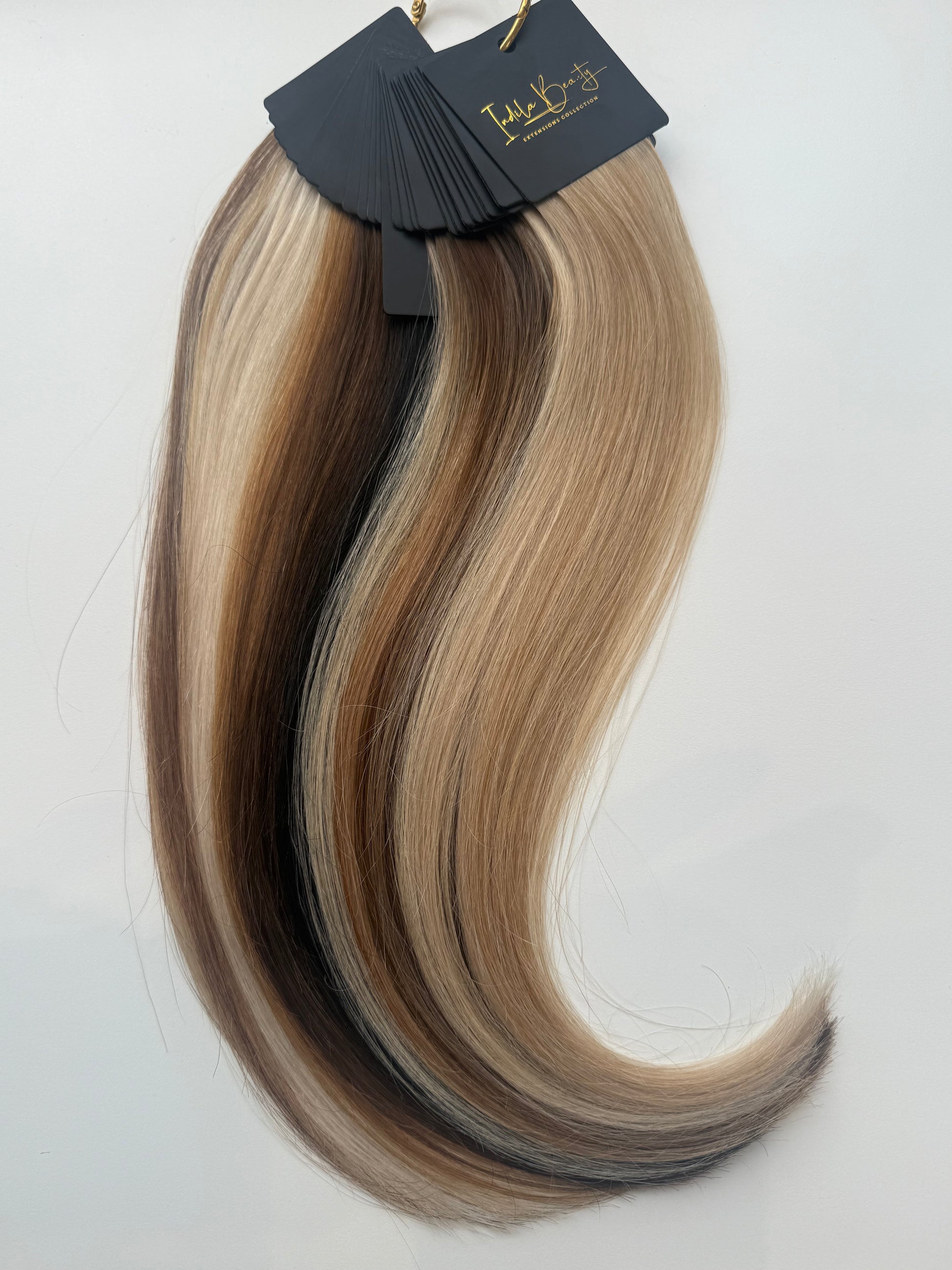 Découvrez notre bague de couleurs professionnelle regroupant l’ensemble de nos 27 nuances d’extensions capillaires. Elle inclut à la fois nos gammes en Remy Hair et en Blonde Cuticule, pour vous permettre de choisir la teinte parfaite avec précision.