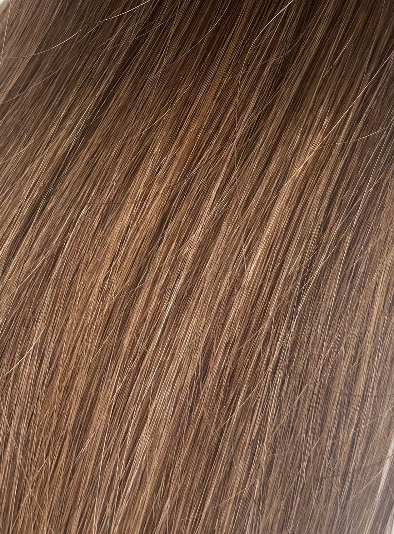 Les mèches sont travaillées de façon très fine et ciblée, pour créer un effet de relief naturel sans démarcation brutale. Le mélange d’un marron très clair et de reflets beiges donne à la chevelure un rendu riche en nuances, avec des jeux de lumière visibles mais parfaitement fondus.
